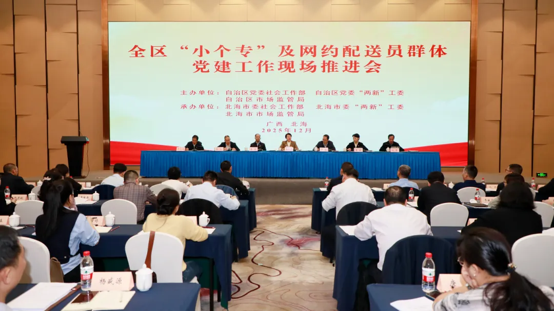 12月23日,全区“小个专”及网约配送员群体党建工作现场推进会在北海召开。会议深入学习贯彻习近平总书记关于新兴领域党建工作重要论述和重要指示,学习贯彻党的二十大和二十届历次全会精神,全面落实中央社会工作会议、新兴领域党建工作座谈会和全国“小个专”及网约配送员群体党建工作座谈会精神,总结交流经验,研究部署下一阶段工作任务。自治区党委社会工作部部长、“两新”工委书记唐轶昂,自治区市场监管局党组书记、局长李泽出席会议并讲话。北海市副市长曾玲出席会议并致辞。市场监管总局“小个专”党建办有关负责同志到会指导。