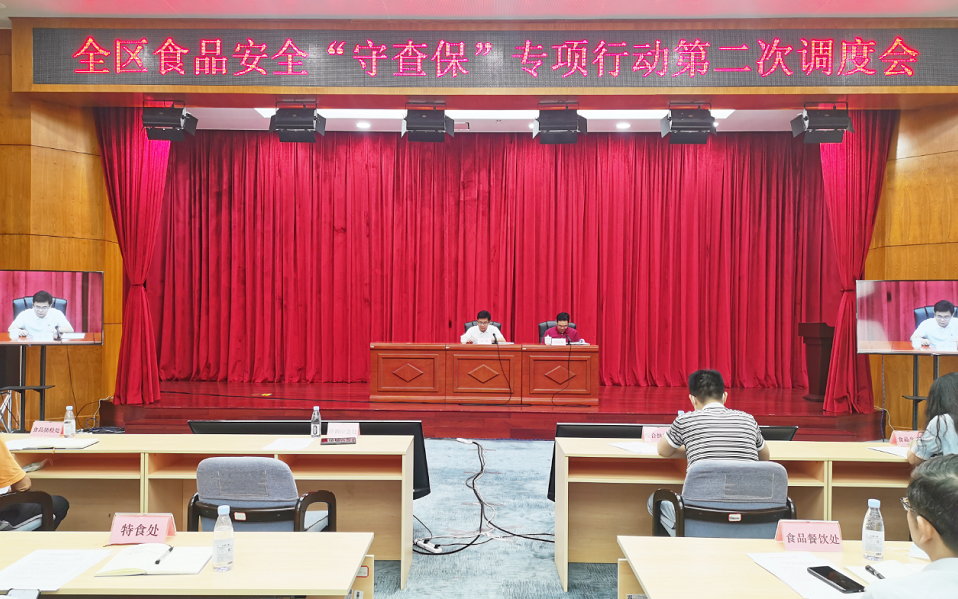 自治区市场监管局二级巡视员胡振洲主持会议,自治区市场监管局有关处室和直属单位负责人、食品安全总监、“守查保”专项行动领导小组全体成员在主会场参加会议,各市局负责同志及有关单位负责同志在分会场参加会议。