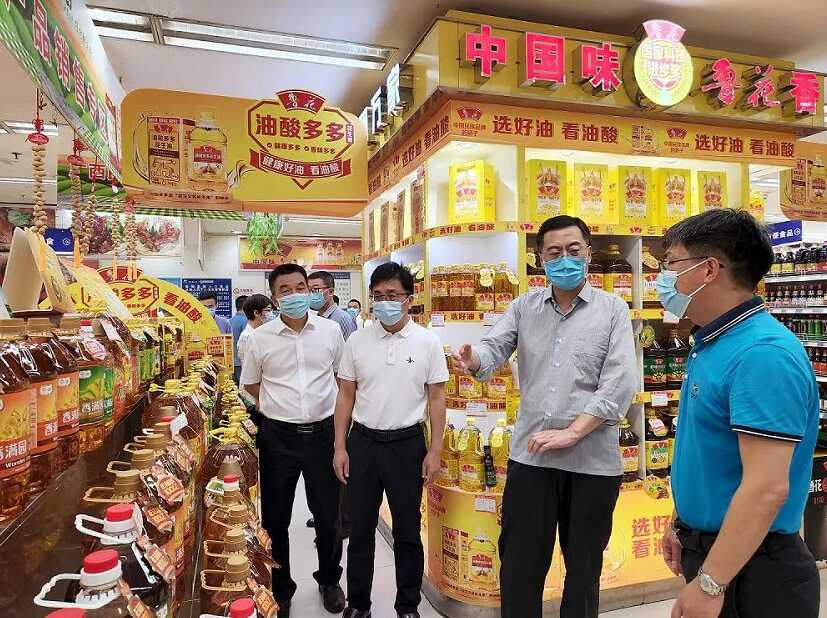 ▲图1 张晋京(右二)一行在桂林市微笑堂超市调研食用植物油监管工作