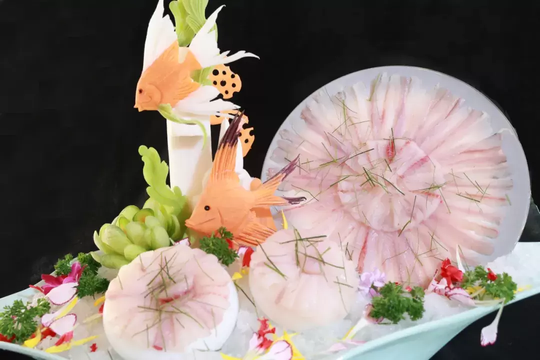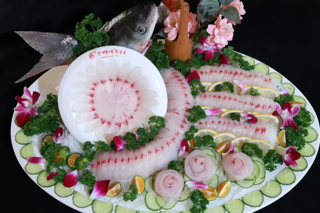 现杀活鱼薄切成片,佐以姜丝、蒜片、花生等十余种蘸料,入口冰凉爽脆。