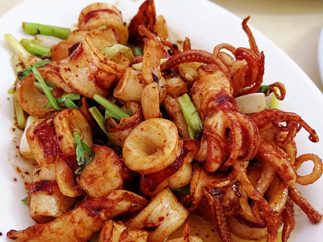 北部湾鱿鱼铁板生煎,弹牙肉质裹海盐焦香,渔家“赶海即烹”的鲜活哲学。