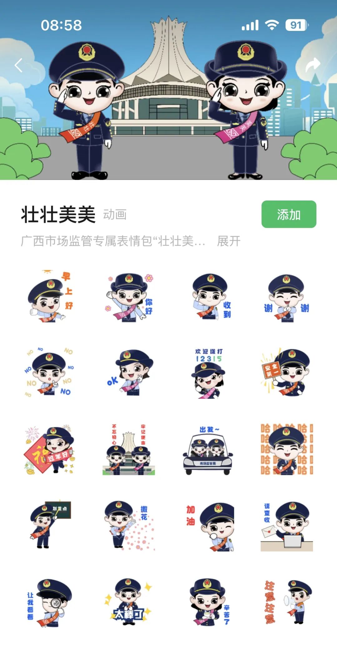 『壮壮美美』表情包以广西市场监管IP形象为原型,身着蓝色的制服,形象生动活泼,表情内容丰富展示市场监管工作服务的多种场景。