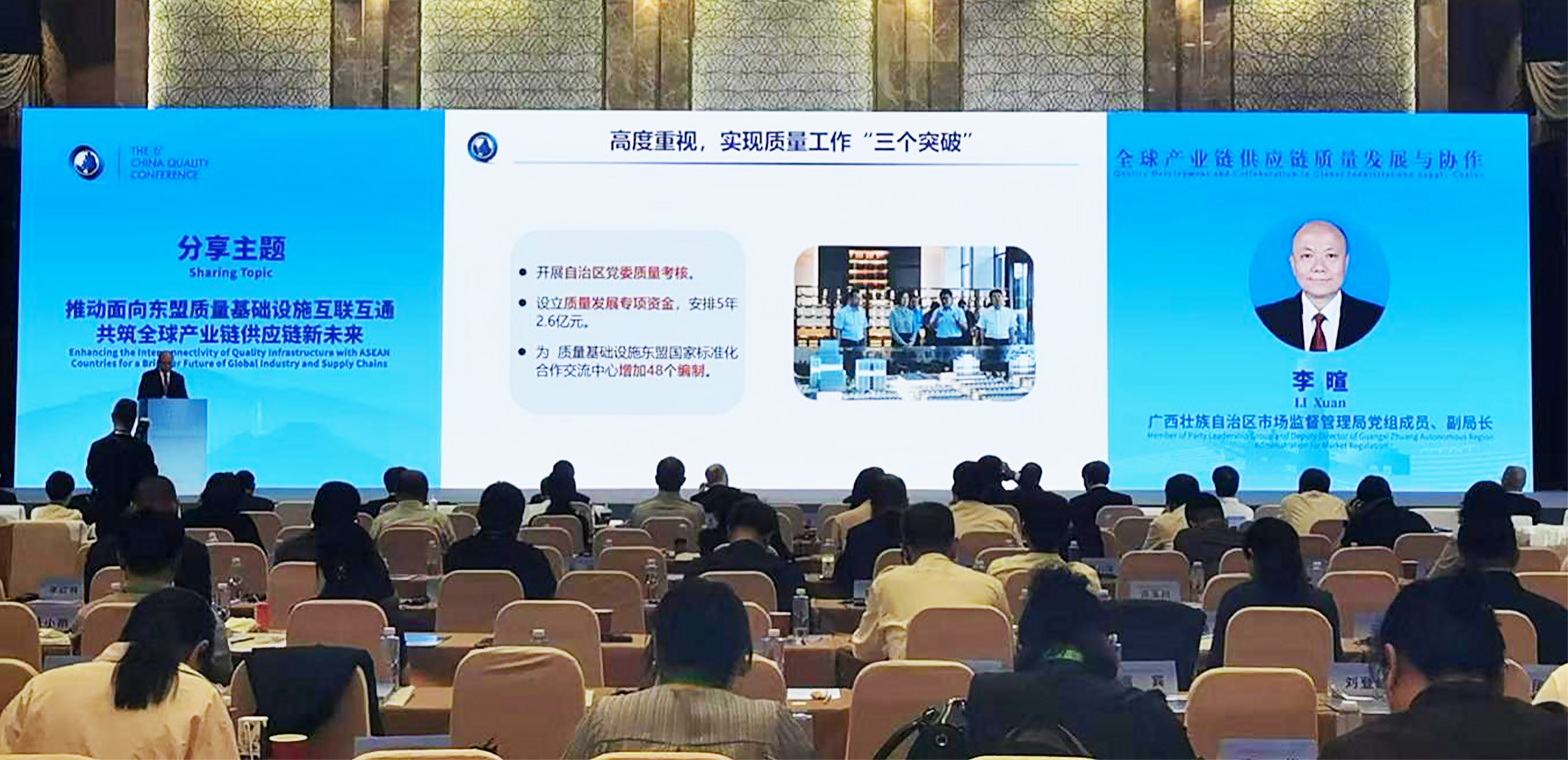 9月16日至17日,中国质量(南京)大会在南京举办,大会以“质量:赋能新质生产力”为主题。广西市场监管局党组成员、副局长李暄在“全球产业链供应链质量发展与协作”专题会议上以《推动面向东盟质量基础设施互联互通 共筑全球产业链供应链新未来》为题作经验分享,介绍了广西“AI+”赋能质量强桂的创新实践,以及推进中国—东盟质量国际合作的经验做法。