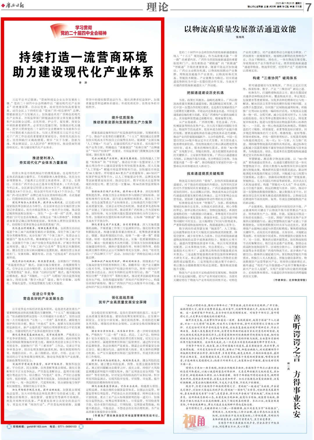 2025年11月26日,《广西日报》第007版刊发文章《持续打造一流营商环境 助力建设现代化产业体系》,全文如下——