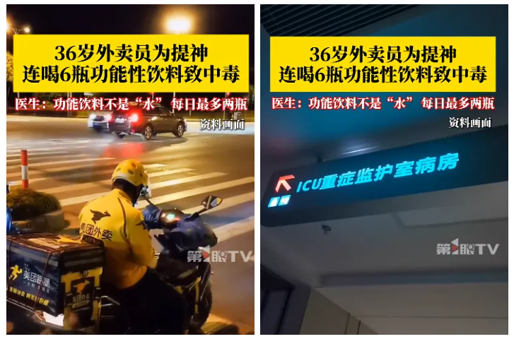 近日,深圳一名36岁男子为了在晚高峰送餐时保持清醒,短时间内连续喝下6瓶功能性饮料。次日中午,该男子开始意识模糊,出现心跳加快、发热、出汗、头部与双手反复抽搐等症状。紧急就医后,被收治进重症监护室(ICU)。
