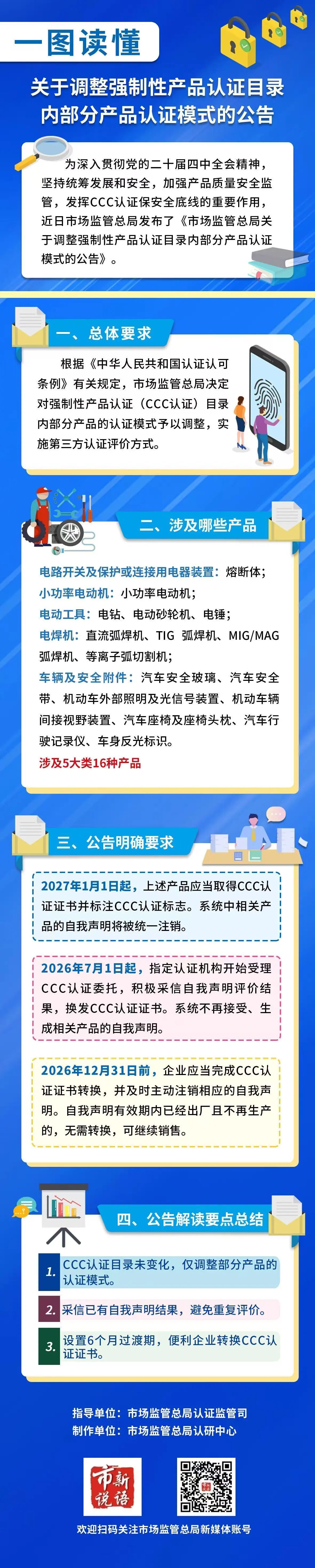 近日,市场监管总局发布《关于调整强制性产品认证目录内部分产品认证模式的公告》(以下简称《公告》),对强制性产品认证(CCC认证)目录内部分产品的认证模式作出重要调整。