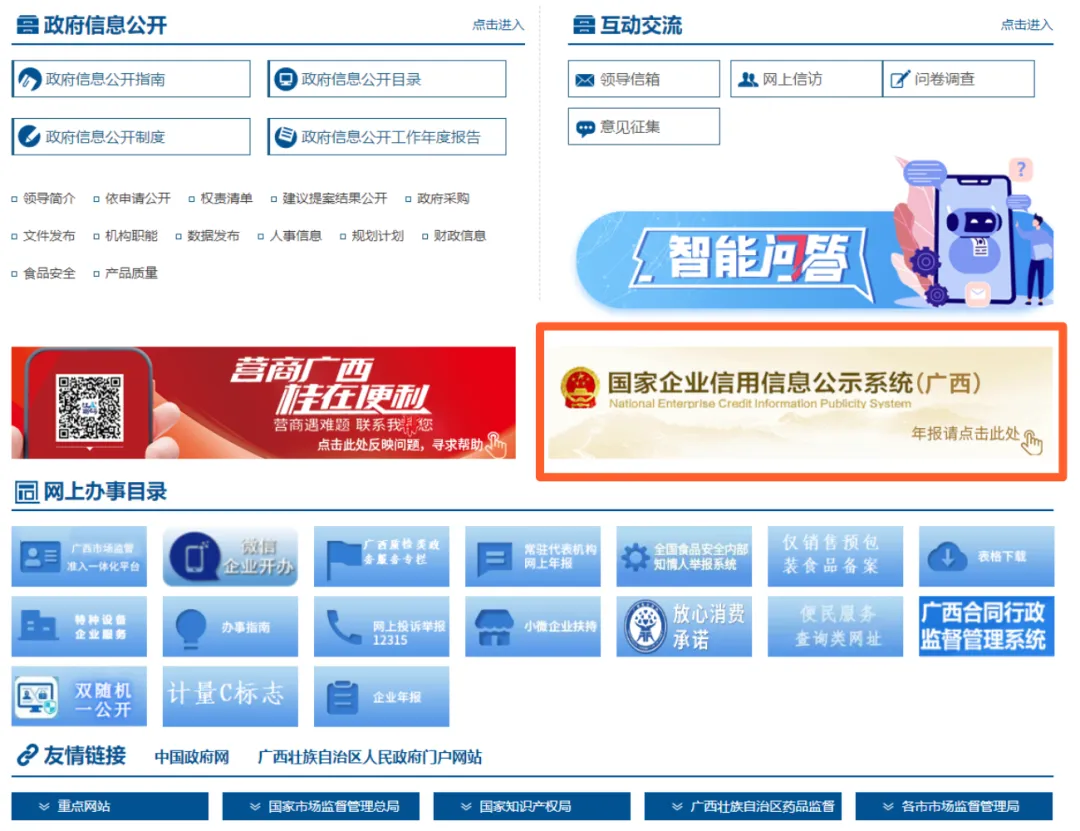 (一)登录广西壮族自治区市场监督管理局官网(http://scjdglj.gxzf.gov.cn/),点击“国家企业信用信息公示系统(广西)”。