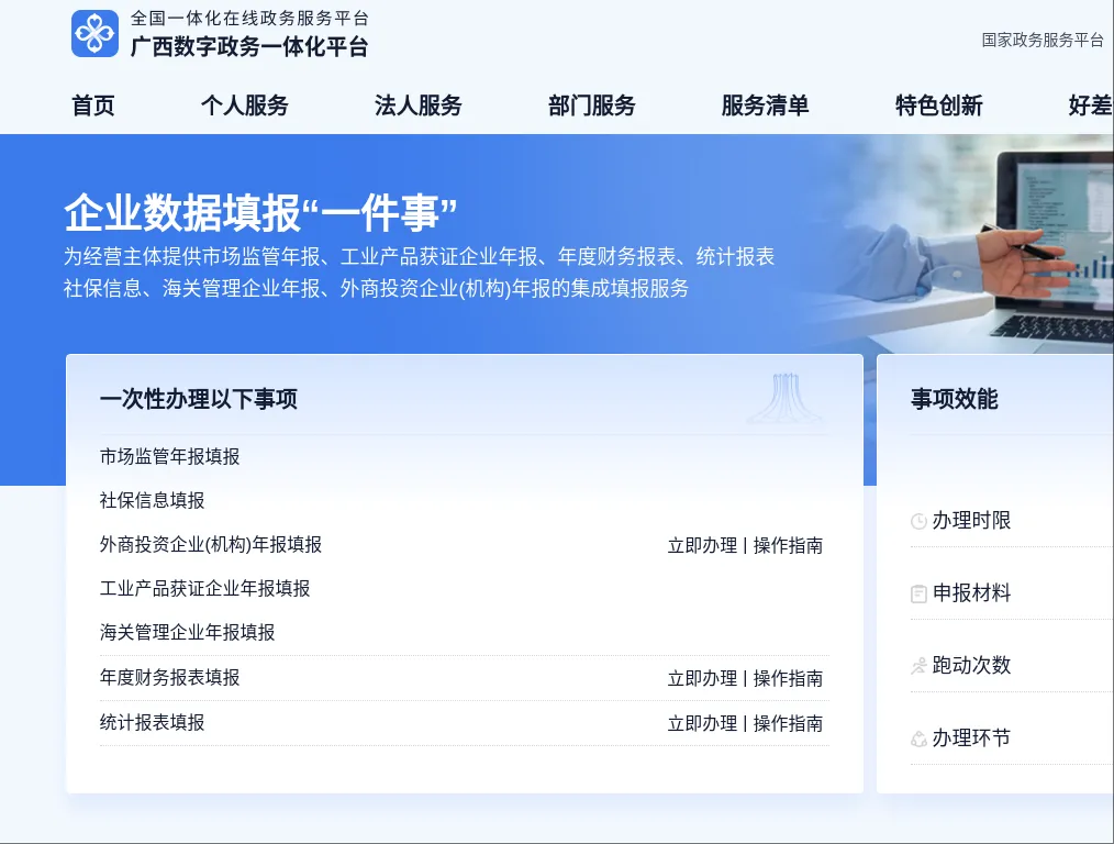 (二)复制下方链接到浏览器,登录广西数字政务一体化平台,搜索并找到企业数据填报“一件事”,点击“在线办理”,可一次填报市场监管、税务、统计等多个年报事项。