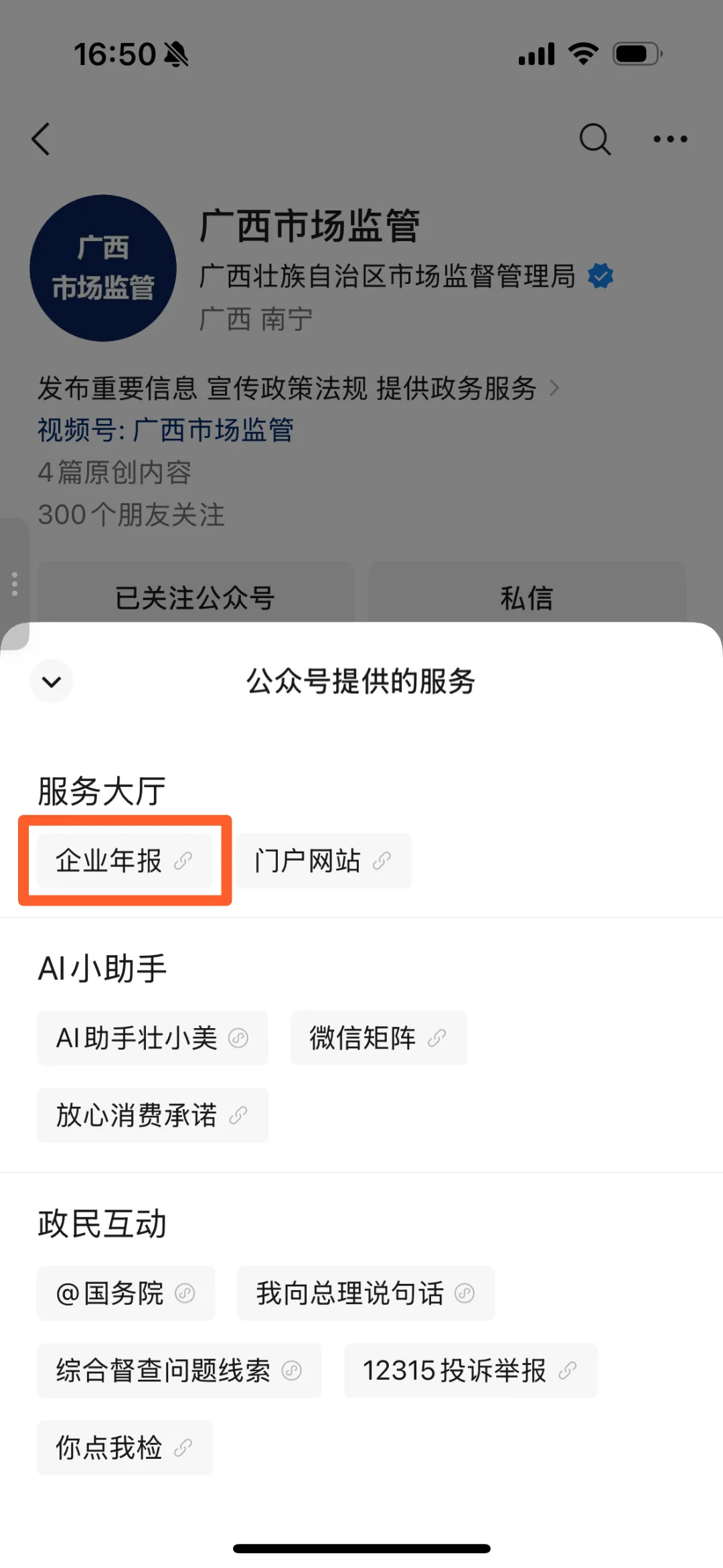 (三)关注“广西市场监管”微信公众号,在服务大厅中选择“企业年报”。