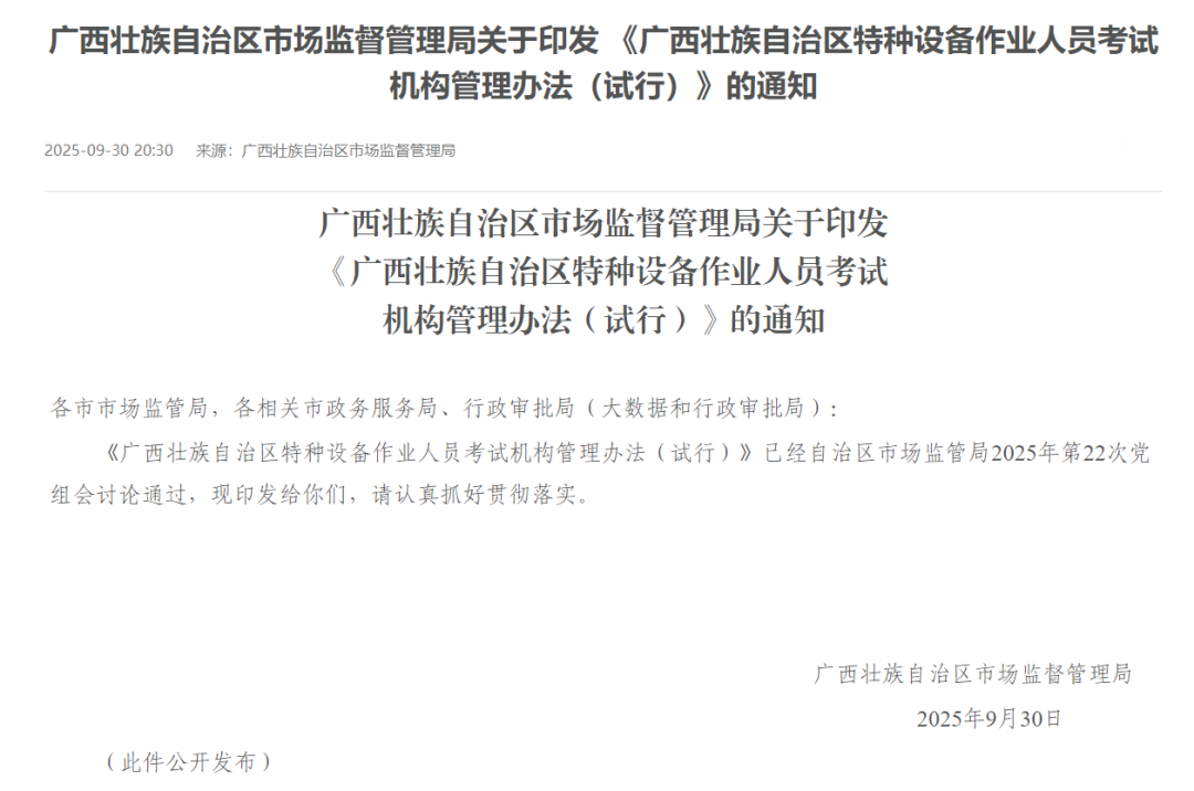率先制定《广西壮族自治区特种设备作业人员考试机构管理办法(试行)》,广西入选全国统一考试题库应用试点省份,强化作业人员源头管理,有效保障作业人员能力素质。服务与督促并进,全区特种设备生产企业年报公示率进入全国前五,企业主体责任意识普遍增强。