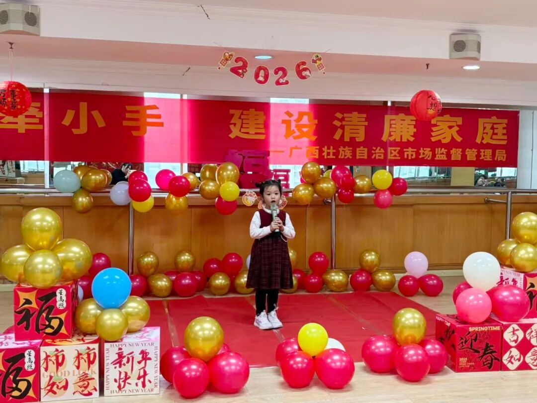 活动在温馨的新年心愿卡书写中拉开帷幕。孩子们身着喜庆服装,在心愿卡上认真绘写对新年的憧憬,稚嫩笔触满载纯真希望。随后的才艺展示环节,小朋友们各自绽放风采。从灵动可爱的舞蹈、自信流畅的英语秀、慷慨激昂的古诗朗诵、虎虎生风的武术表演,再到深情朗诵的原创作品《八桂新岁谣》,孩子们或歌或舞,或诵或演,不仅大胆展示了自我,更在节目准备与表演中,潜移默化地体悟着勇气、自信的家风内涵,在朗朗童声中传递着穿越千年的文化韵律与家国情怀。