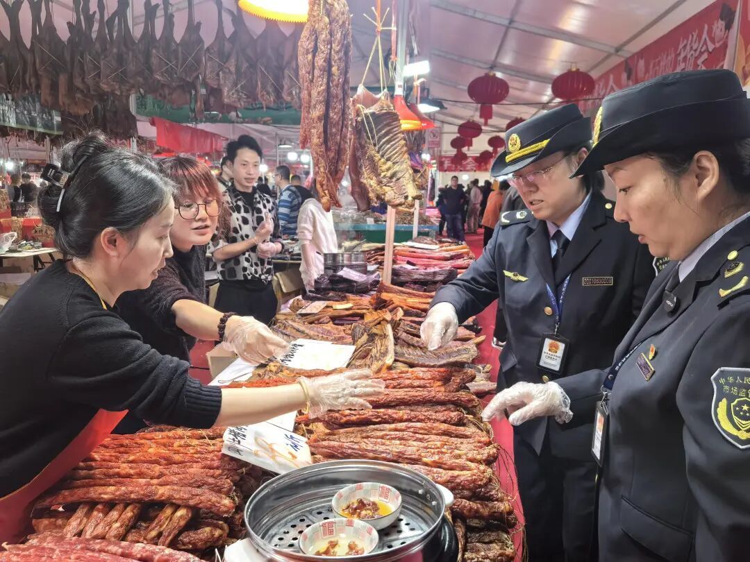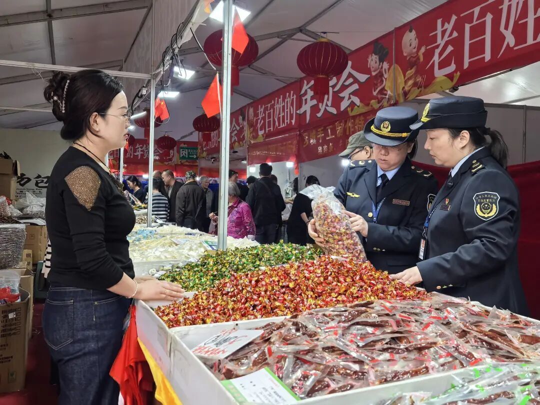 当天中午,前来购物的消费者越来越多,购物袋里的腊肉、粽子、糖果散发着阵阵香气,脸上的笑容格外真挚。“市监蓝”的身影依然在摊位间穿梭。这抹流动的“市监蓝”让每一份年货都承载着安心、让每一次团圆都充满底气,成为这个春节最动人的底色,为消费者送上了一份跨越寒冬、温暖人心的新春守护。