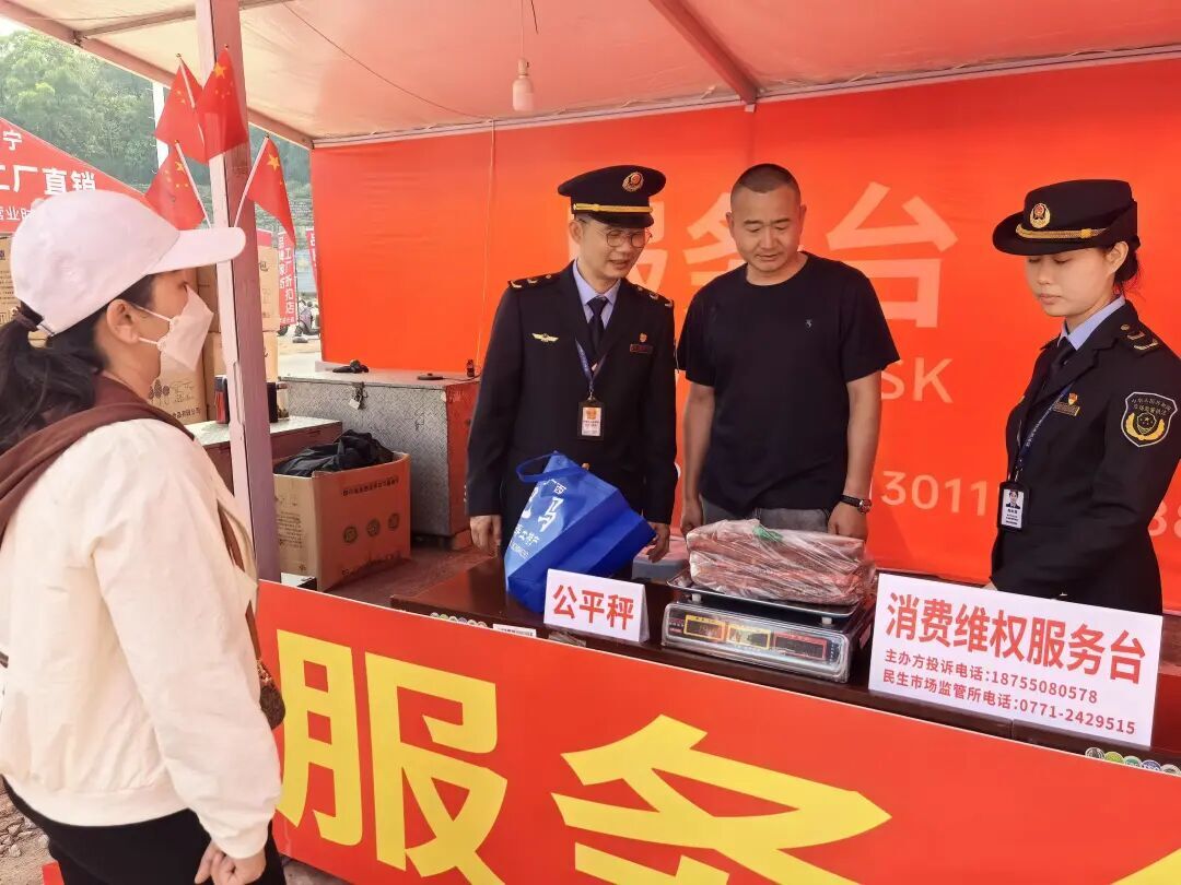 在年货市场入口处,兴宁区市场监管局设置有公平秤和消费维权服务台。“有了公平秤,买东西更放心了!”消费者李女士提着买的腊肠,特意到公平秤上复称,看到重量丝毫不差,满意地点了点头。