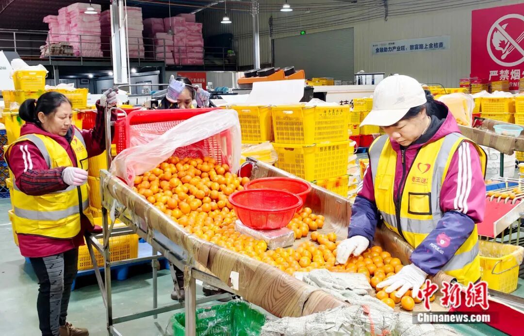 在广西柳州市融安县,工人们正在分拣融安金桔。谭凯兴 摄
