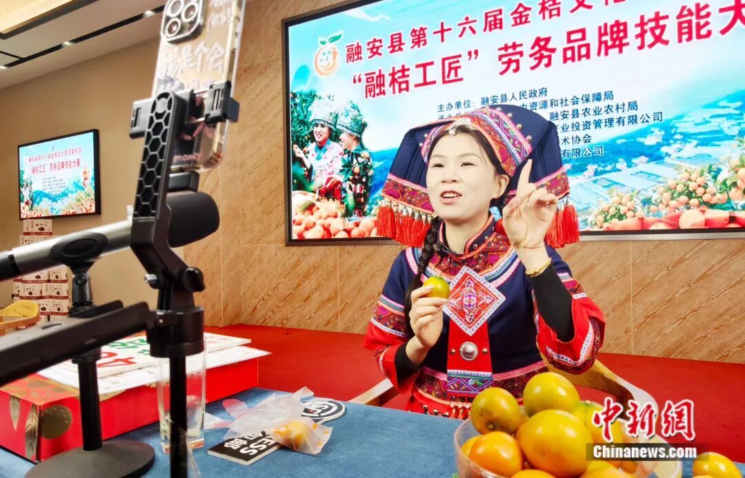民众正在直播,线上推销融安金桔。谭凯兴 摄