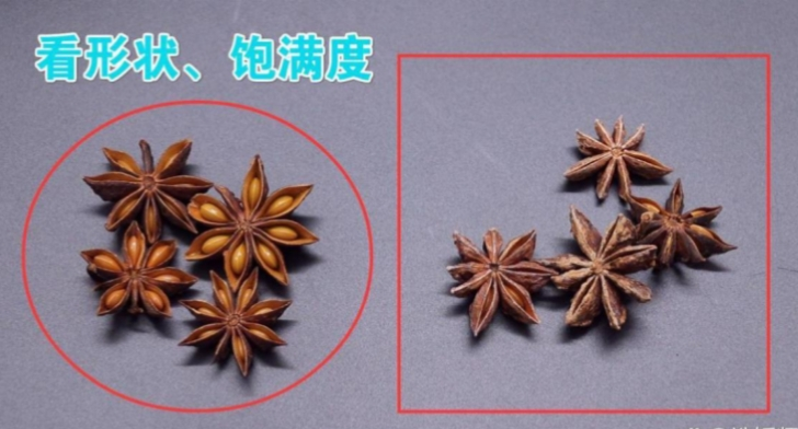看饱满度:优先选择角瓣较为肥厚饱满的八角。角瓣肥厚饱满意味着八角发育良好,内部的含油量更高,香气更浓郁,角瓣薄而干瘪,往往品质较差。