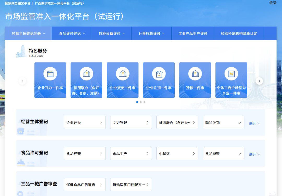通过“广西数字政务一体化平台”-“特色创新”-“市场监管准入一体化平台”。
