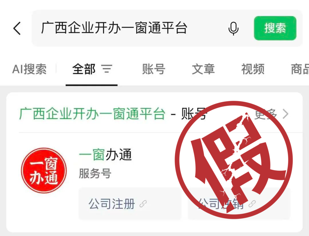 避雷!微信搜索广西企业开办一窗通平台错误结果!
