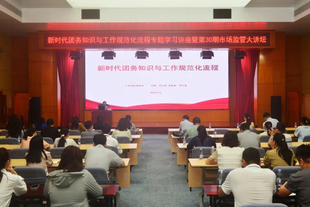 为贯彻落实党的二十届三中全会精神,加强思想政治引领,进一步提升青年团干综合能力水平,凝聚踔厉奋发的市场监管青春力量,广西市场监管局近日举办新时代团务知识与工作规范化流程专题学习讲座暨第30期市场监管大讲坛。