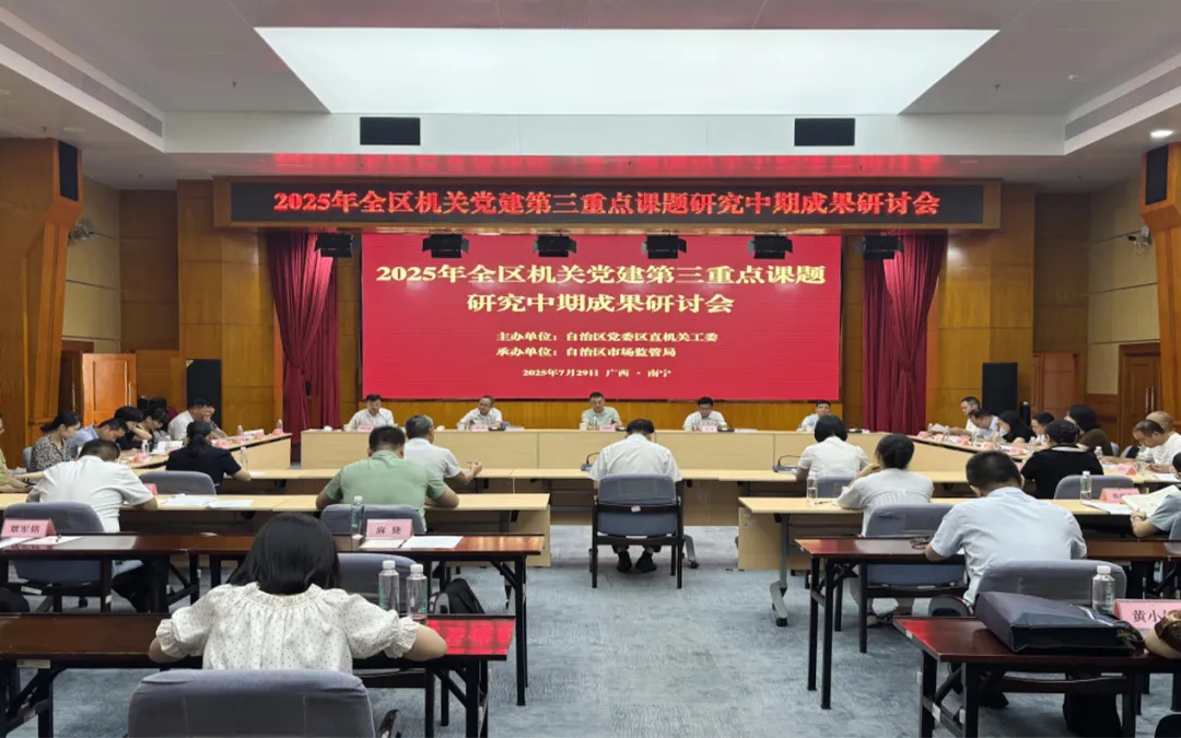 近日,由自治区党委区直机关工委主办,广西市场监管局承办的2025年全区机关党建第三重点课题研究中期成果研讨会顺利召开。自治区党委区直机关工委副书记邹颖明,自治区市场监管局党组成员、副局长、一级巡视员、机关党委书记黄震,自治区党员教育中心副主任、二级巡视员,广西党建研究会常务理事孙红出席会议。