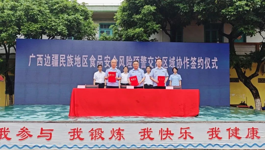 近日,由广西市场监管局主办的广西边疆民族地区食品安全“你点我检 服务惠民生”进校园暨风险预警交流区域协作签约活动在东兴市京族学校举行,防城港、百色、崇左三个边境市市场监管局签订《广西边疆民族地区食品安全风险预警交流合作协议》,约定共同探索构建食品安全风险预警交流区域协作机制,提升食品安全区域风险防控和应对能力,筑牢国门食品安全防线。