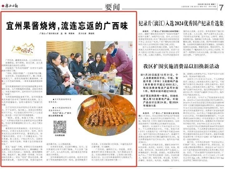 1月21日《广西日报》以《宜州果酱烧烤,令人沉醉的广西风味》为题深度报道了这一独特美食。