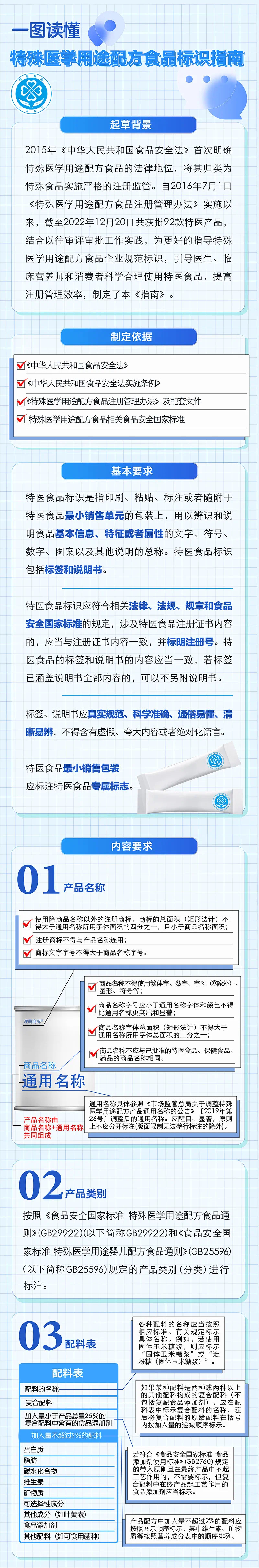 为指导特殊医学用途配方食品(以下简称特医食品)企业规范标识,引导医生、临床营养师和消费者科学合理使用特医食品,市场监管总局近日制定发布《特殊医学用途配方食品标识指南》(以下简称《指南》)。《指南》分为五个部分,包括基本要求、内容要求、主要展示版面要求、禁止性要求和其他要求。