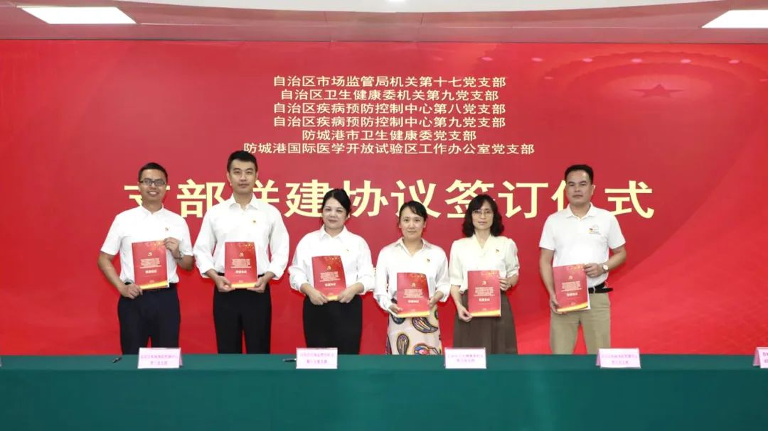近日,广西市场监管局机关第十七党支部、自治区卫生健康委机关第九党支部、自治区疾病预防控制中心第八党支部、自治区疾病预防控制中心第九党支部、防城港市卫生健康委党支部、防城港国际医学试验区工作办党支部共同开展支部联建活动,签订了为期三年的支部联建协议,以党建工作推动防城港国际医学开放试验区健康食品产业高质量发展。自治区市场监管局党组成员、副局长、一级巡视员黄震,自治区卫生健康委党组成员、副主任吴兴华等出席活动并见证签约。