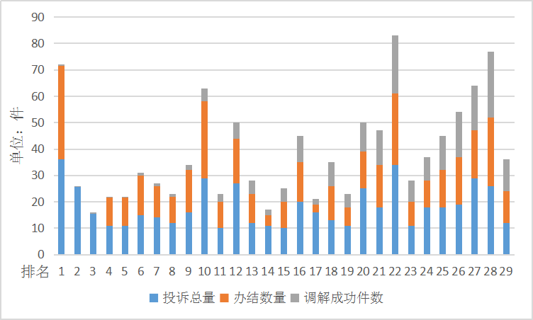 (注:①被投诉主体按照调解成功率由低至高进行排序。②数据导出日期为2021年4月19日。③办结:指行政部门工作人员依法对投诉做出接收、登记、分送、办理、反馈处理,办理完成。④调解成功:指投诉人和被投诉方达成调解协议、双方自行和解或投诉人撤回投诉。)