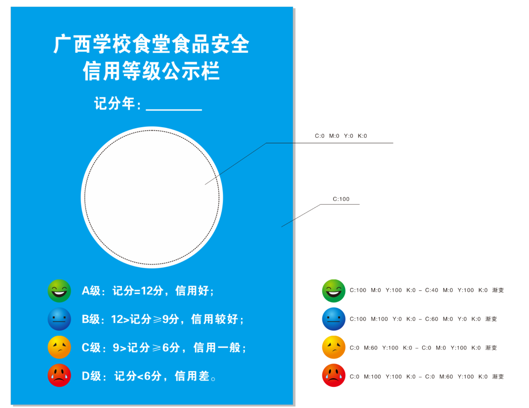 第九条 信用等级标识为绿脸、蓝脸、黄脸、红脸,信用等级从高到低依次为:A级,记分=12分,信用好,赋绿脸;B级,12>记分≥9分,信用较好,赋蓝脸;C级,9>记分≥6分,信用一般,赋黄脸;D级,记分<6分,信用差,赋红脸。