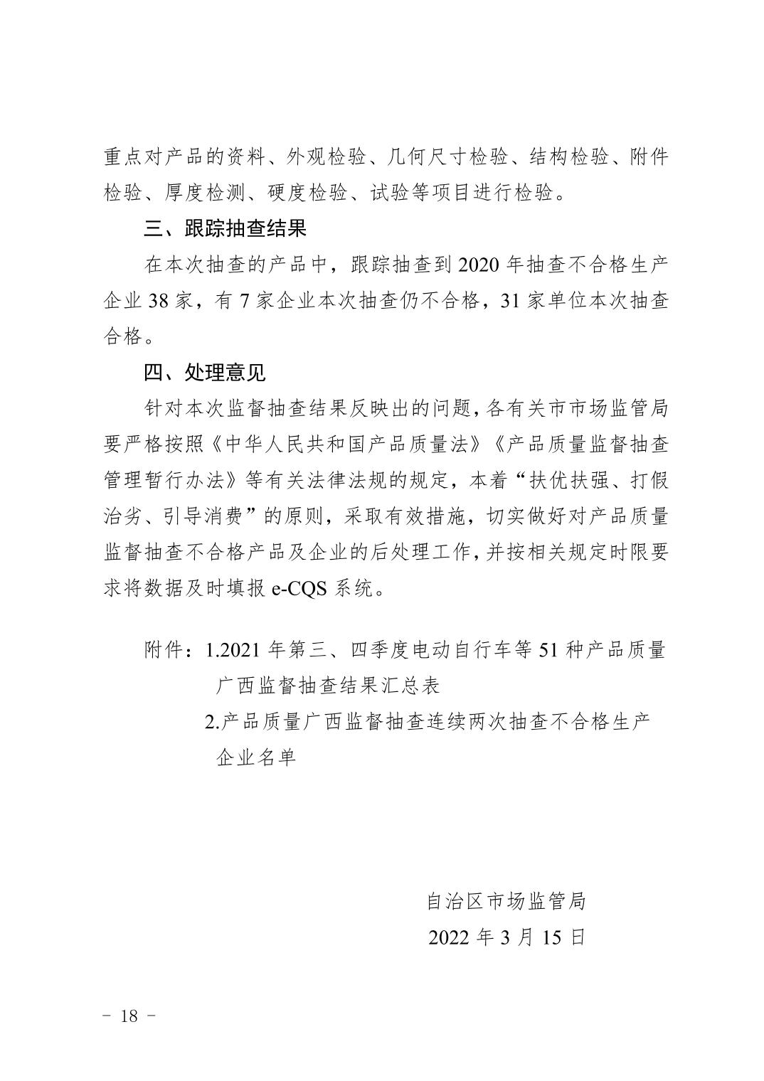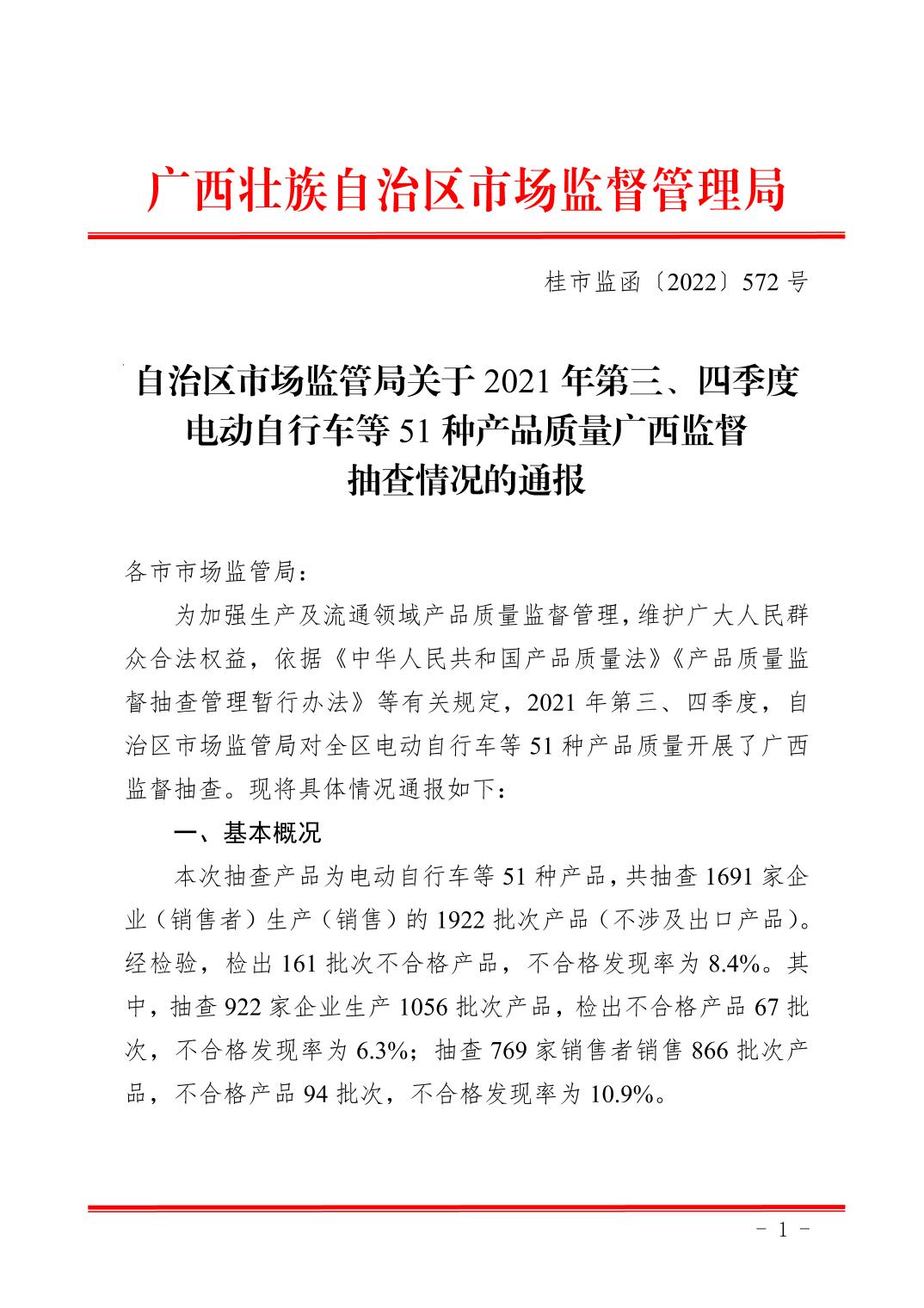 自治区市场监管局关于年第三四季度电动自行车等51种产品质量广西监督抽查情况的通报
