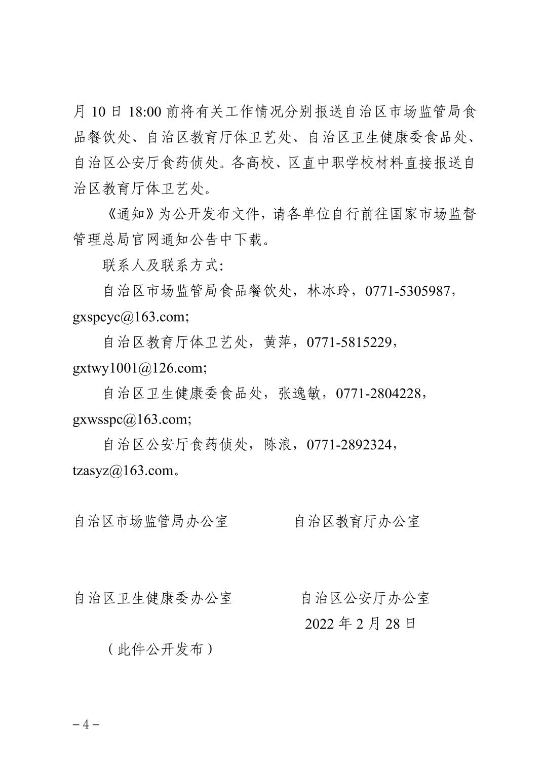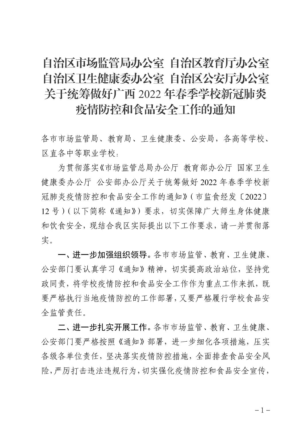 自治区市场监管局办公室 自治区教育厅办公室 自治区卫生健康委办公室 自治区公安厅办公室 关于统筹做好广西2022年春季学校新冠肺炎 疫情防控和食品安全工作的通知