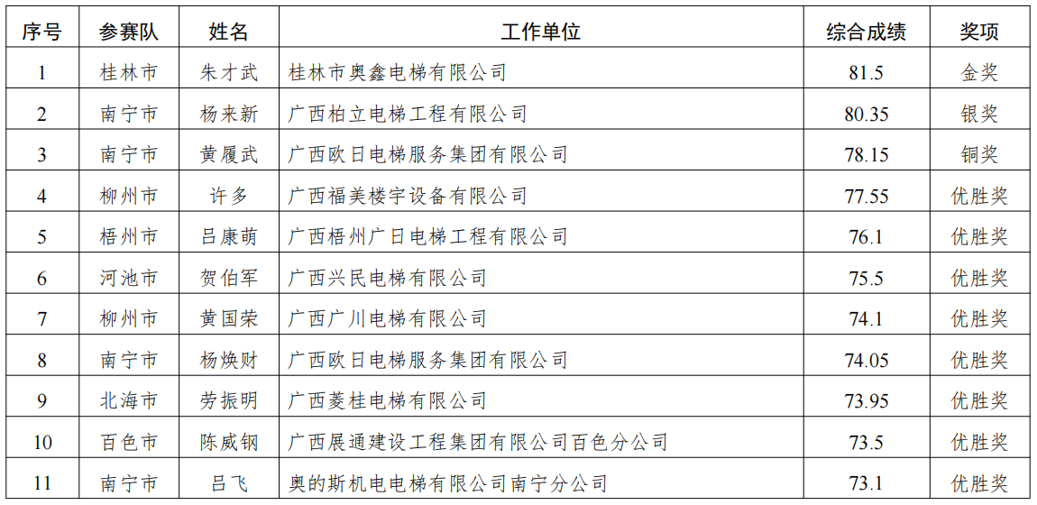 为深入贯彻落实党的二十大精神和习近平总书记对技能人才工作系列重要指示精神,大力弘扬劳模精神、劳动精神、工匠精神,搭建电梯行业职业技艺技能展示、相互学习交流的平台,全面提高我区电梯行业人员的职业技能,促进全区电梯安全管理水平提升,2023年8—9月,由自治区市场监管局、自治区人力资源和社会保障厅联合举办,广西特检院、广西质量技术工程学校具体承办的2023年广西电梯行业职业技能竞赛在南宁成功举办。14个设区市共100名参赛选手参加了竞赛,根据竞赛奖项设置,经竞赛组委会审核,朱才武、杨来新、黄履武等3名参赛选手分别获金奖、银奖、铜奖,许多等13名参赛选手获优胜奖,现公布竞赛获奖名单。