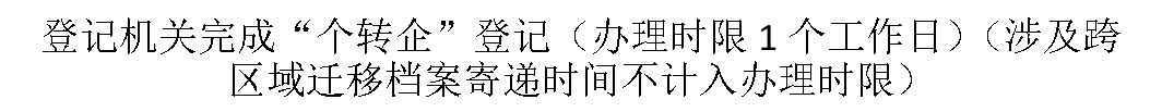 承诺办理时限:2个工作日(其中:个体工商户转型为企业变更登记1个工作日;以下事项并联办理:转型后企业公章刻制0.5个工作日、社会保险登记或参保信息变更1个工作日、住房公积金企业缴存登记或信息变更1个工作日、医疗保险登记或参保信息变更1个工作日、基本账户开设或账户信息变更预约1个工作日、发票总额度授予1个工作日。)