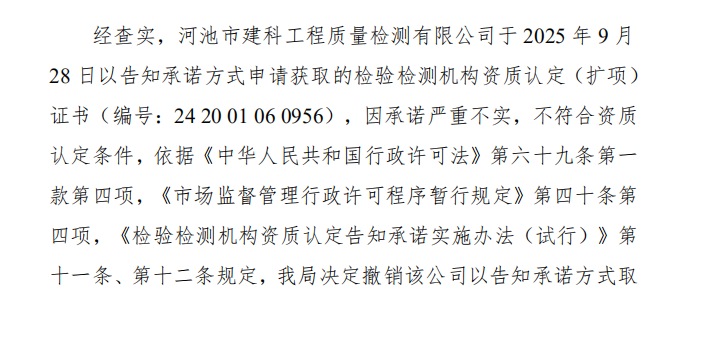 广西壮族自治区市场监督管理局关于撤销河池市建科工程质量检测有限公司检验检测机构资质认定扩项证书的(2026年第18期)