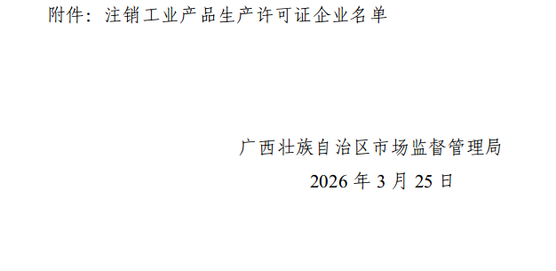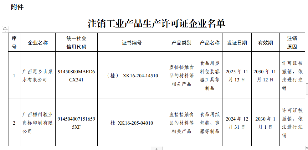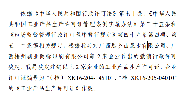 广西壮族自治区市场监督管理局关于注销广西思乡山泉水有限公司等2家企业工业产品生产许可证的通告