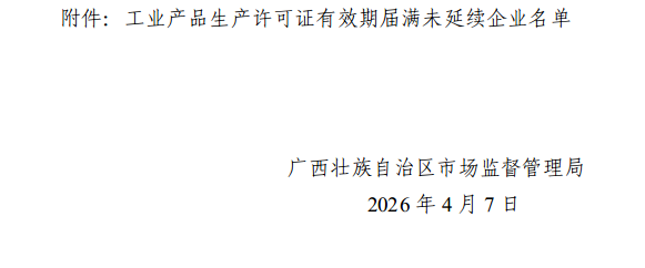 依据《中华人民共和国行政许可法》第七十条第一项、《中华人民共和国工业产品生产许可证管理条例》第三十一条、《中华人民共和国工业产品生产许可证管理条例实施办法》第三十五条第一项及《市场监督管理行政许可程序暂行规定》第四十九条第一项、第五十二条等相关规定,我局决定对钦州市金雅松日用品有限公司等902家有效期届满未延续企业的工业产品生产许可证依法予以注销,原证书作废(详见附件)。