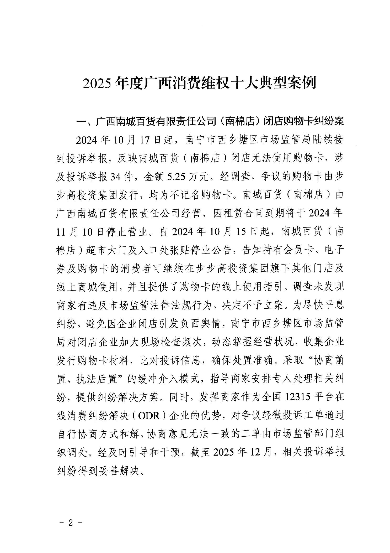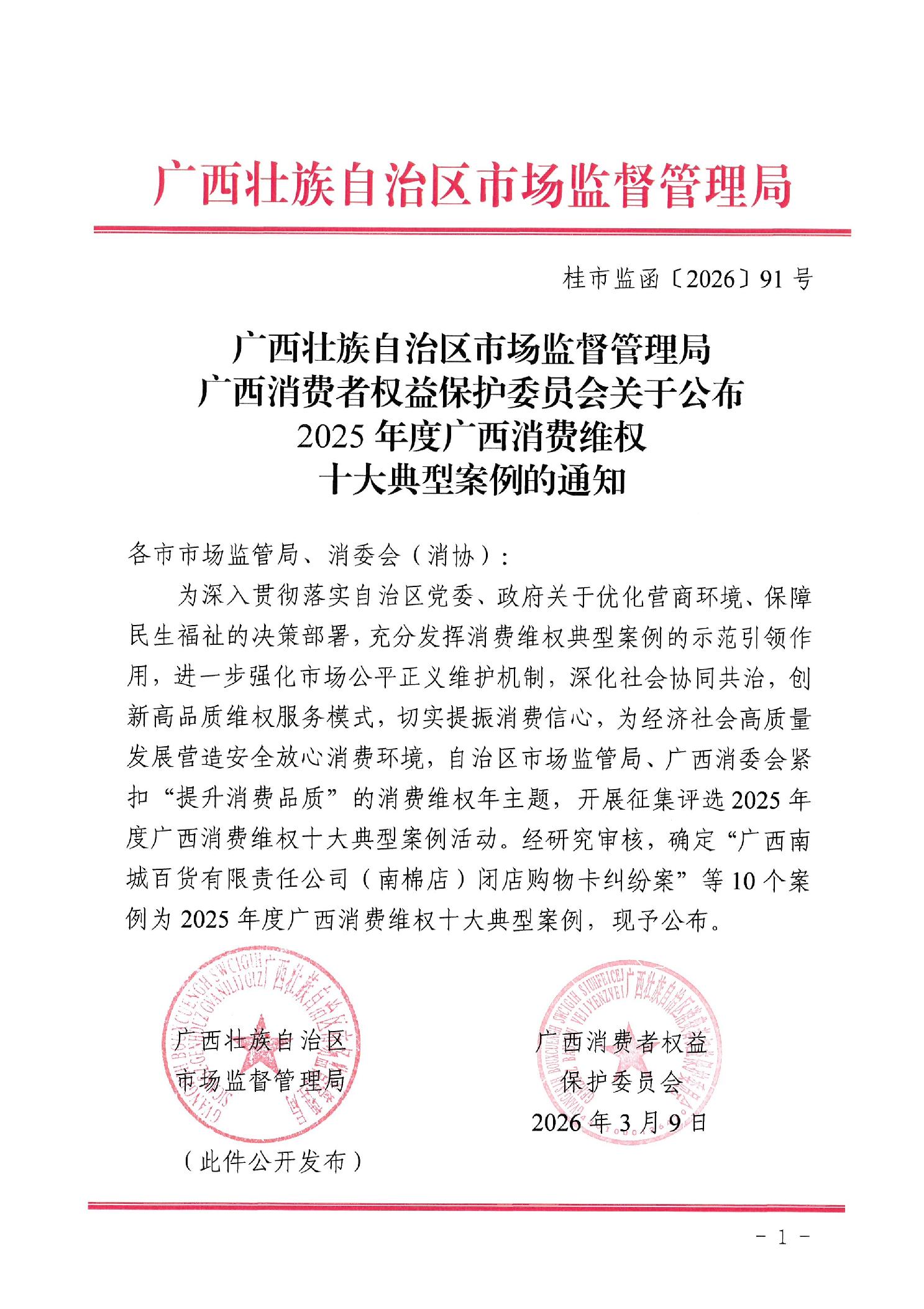 广西壮族自治区市场监督管理局 广西消费者权益保护委员会关于公布2025年度广西消费维权十大典型案例的通知